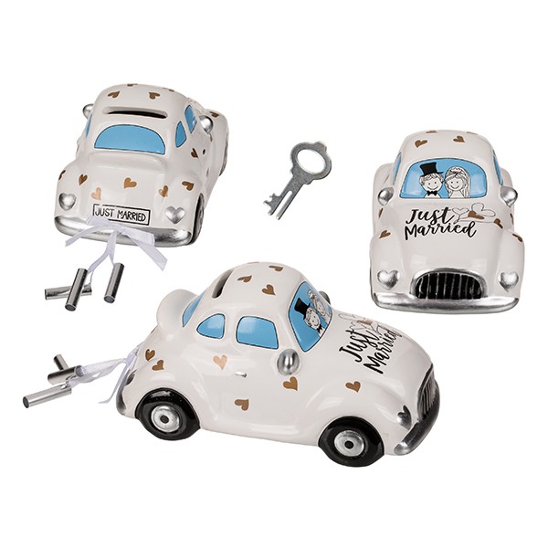 Tirelire en céramique avec serrure. Voiture de mariage avec lettrage Just married. 16 x 8,5 cm.