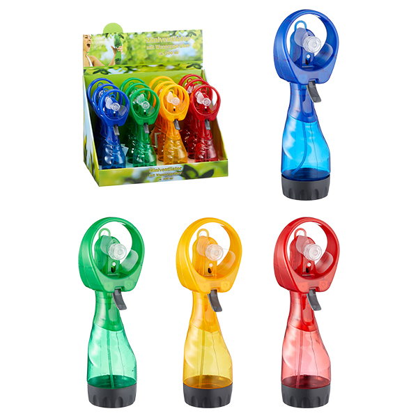 Ventilateur brumisateur. Ce ventilateur pulvérisé agréable une amende jet d'eau, idéal pour les journées chaudes. Couleurs gris, vert, violet et bleu. Contenance 25cl.