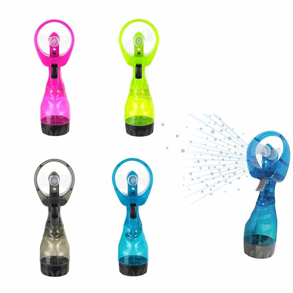 Ventilateur brumisateur. Ce ventilateur pulvérisé agréable une amende jet d'eau, idéal pour les journées chaudes. Couleurs gris, vert, violet et bleu. Contenance 25cl.