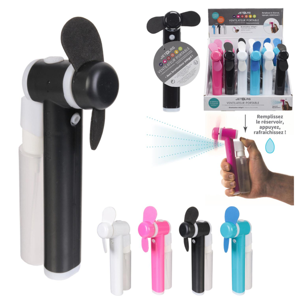 Remplissez le réservoir de ce ventilateur brumisateur. appuyez et profitez d'un rafraîchissement instantané ! - Fonctionne avec 2 piles AA. LR6 non incluses - Portable