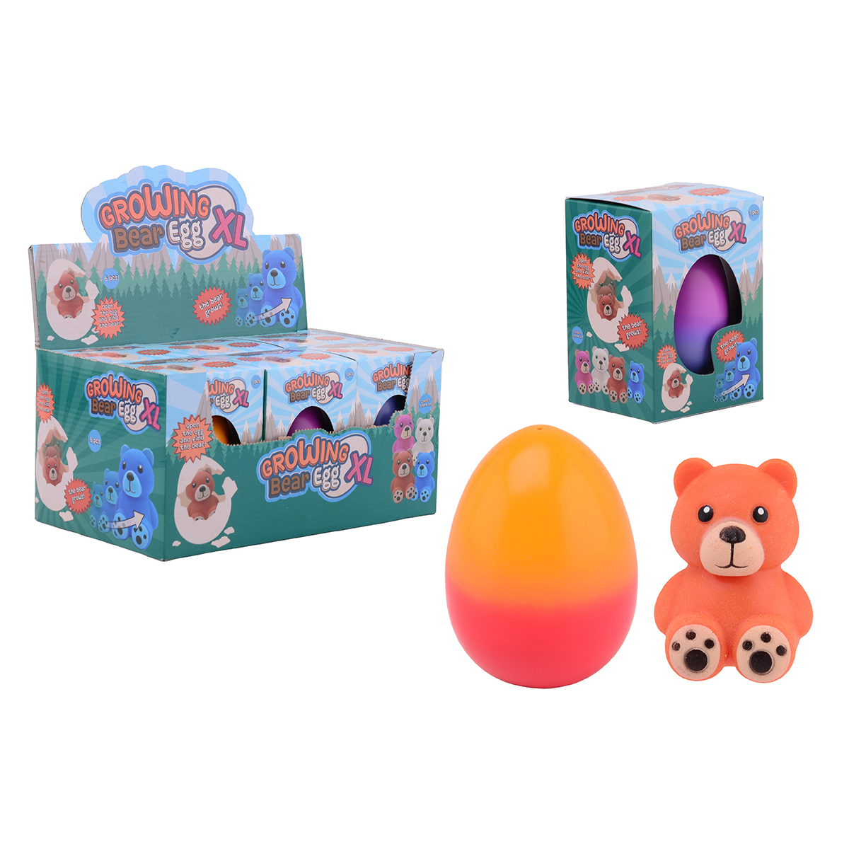 On met l'œuf pendent 72 heures dans l'eau, il grandit ensuite un ours. Les oeufs avec les ours de croissance viennent assortis dans un display.