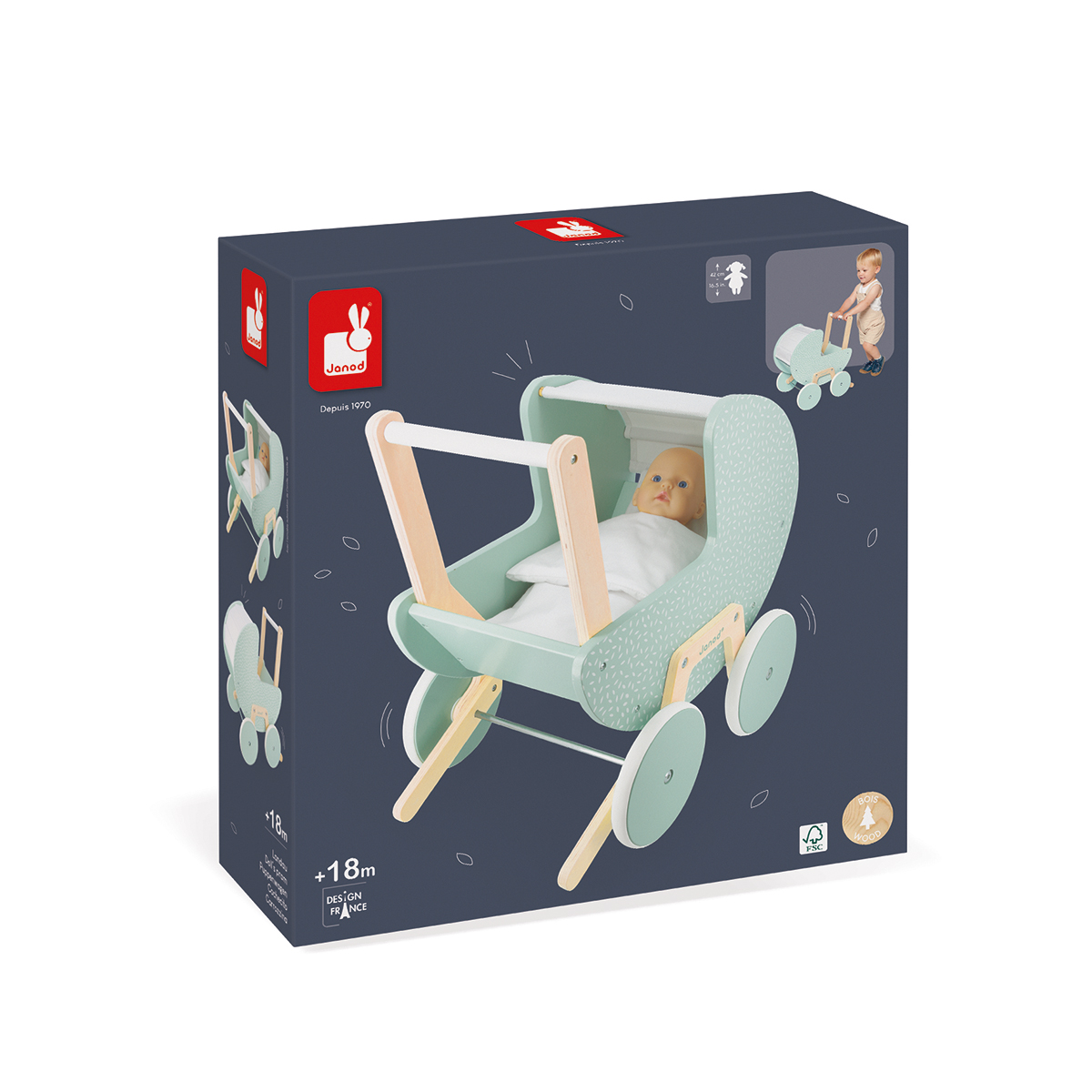 En avant pour de longues balades avec bébé… Véritable réplique d’un landau de bébé, ce jouet en bois est idéal pour accompagner votre enfant dans ses premières explorations. Il pourra imiter les plus grands et emmener ses poupées et ses doudous en balade. Pour une sécurité optimale, ce landau est équipé d’un système anti-bascule amovible que vous pourrez retirer lorsque votre enfant se sentira plus à l’aise dans sa démarche. Il est livré avec une jolie couverture et un oreiller pour que doudous et poupées soient confortablement installés. Roues silencieuses en caoutchouc qui ne tâchent pas les sols. Capote en tissu. Compatible avec les poupons jusqu’à 42 cm (poupon non fourni). Jouet d’imitation en bois pour les enfants à partir de 18 mois.