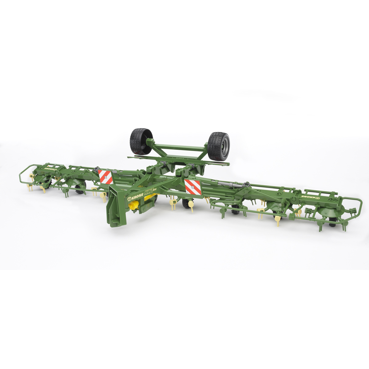 L'efficacité maximale joue un rôle de plus en plus important dans l'agriculture. Dans le domaine du travail en prairie, l'épandeur-faneur Krone KWT 8.82 fait figure de modèle. En combinaison avec de petits tracteurs, la structure spécialement conçue de son bras lui permet de parcourir de très larges surfaces. Le modèle BRUDER de l'épandeur-faneur est fidèle à l'original en termes de sensation et peut être combiné à tous les tracteurs de la série Profi. Les flèches rabattables du modèle peuvent être repliées et le mécanisme peut être abaissé pour les travaux dans les champs et relevé lors du transport sur route. Cette caractéristique permet un transport rapide entre le lieu d'utilisation et la ferme, ou inversement. Ce modèle se caractérise par des toupilles activées séparément, qui fonctionnent par paires comme pour l'original. Les dents de toupies opposées (tournant vers la gauche et la droite) sont peintes de couleurs différentes chez Krone. Selon le slogan pour les miniatures comme pour l'original, les modèles réduits présentent les mêmes codes de couleurs.