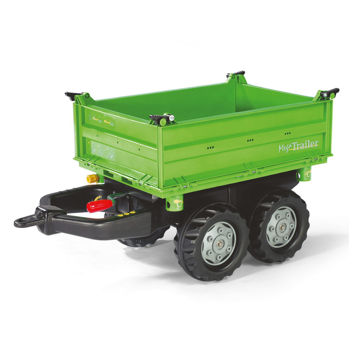 Benne basculante trois côtés, grande remorque à grande capacité de charge avec essieu-tandem pour tracteurs à pédale, fonctionnement protypique, basculant vers 3 côtés par simple changement de 2 boulons de sécurité avec un cric à parallélogramme articulé, extrêmement stable et résistant, couleur vert Deutz