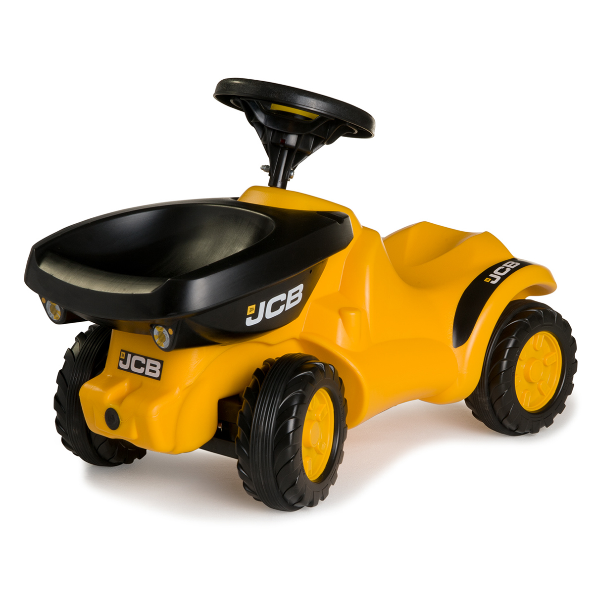 Trotteur-pousseur avec benne à bascule frontale, profil ergonomique du véhicule avec benne coudée, commande de fusée d'essieu stable, volant avec klaxon, roues avec chemins de roulement silencieux