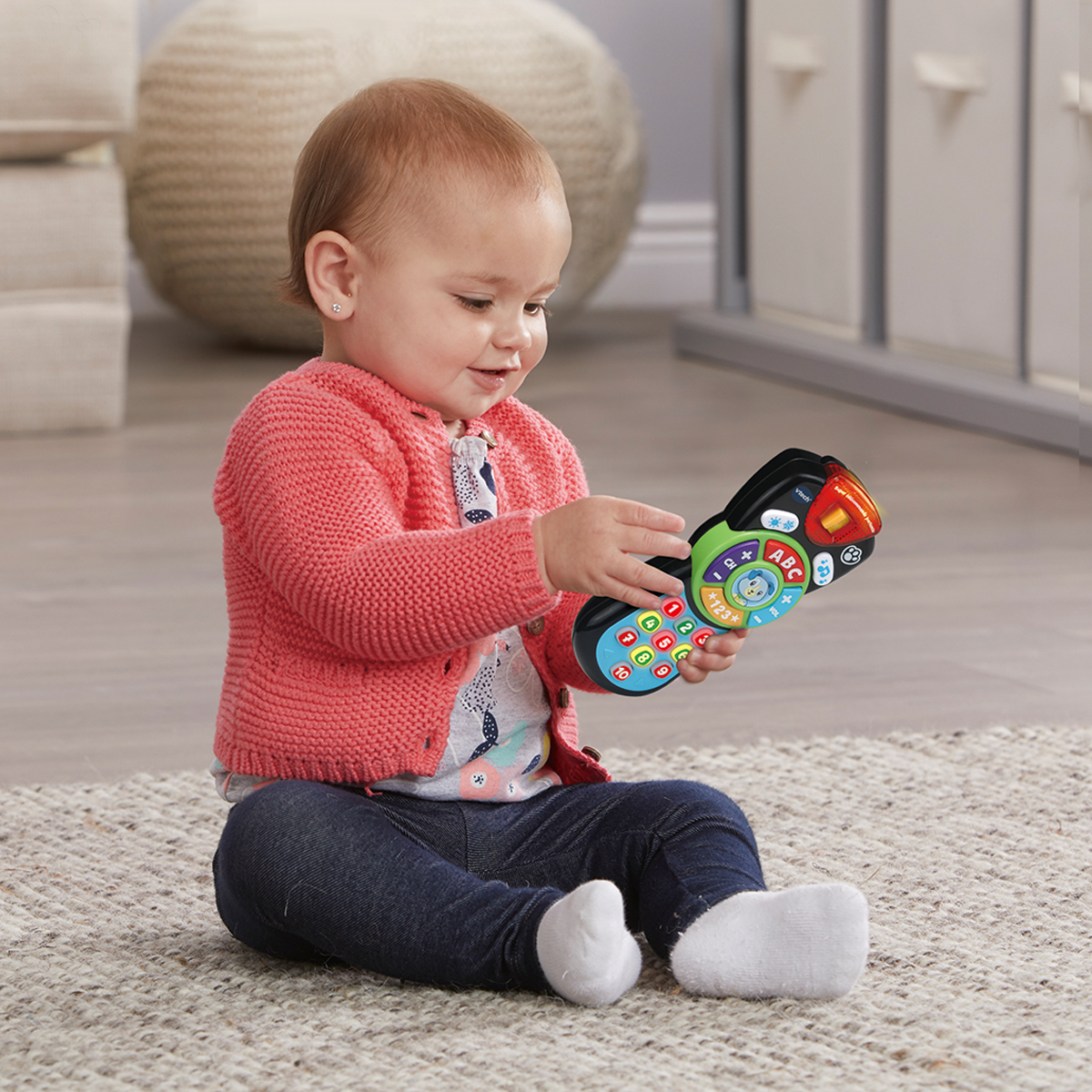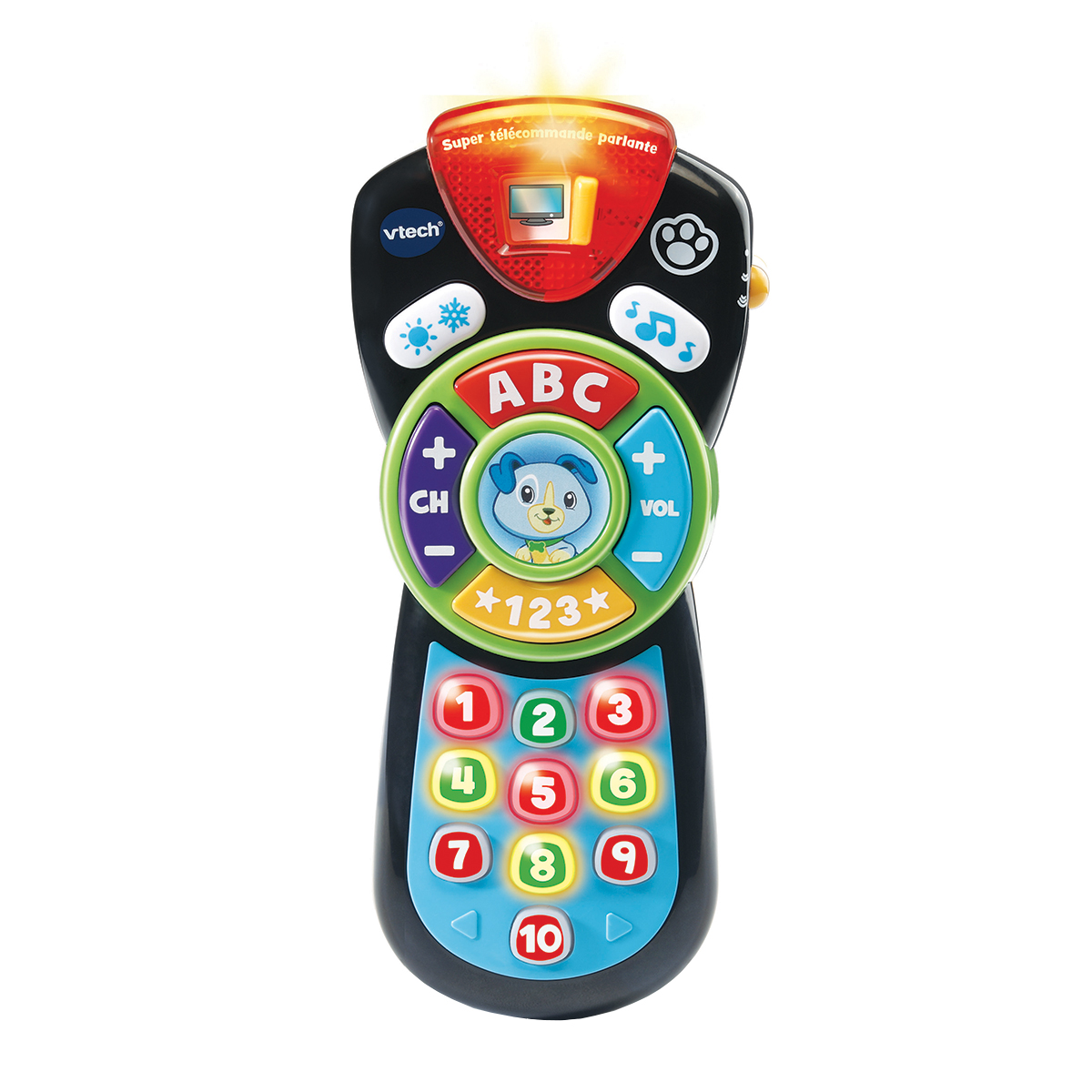 Une super télécommande pour imiter les grands. Skip, le petit chien interagit avec bébé et l'accompagne dans ses découvertes de l'alphabet en chanson et des nombres de 1 à 10. Comme une vraie télécommande chaque nombre correspond à une chaine. Un bouton musique pour déclencher des mélodies entrainantes et Skip informe l'enfant sur la météo du jour grâce au bouton météo. Des effets lumineux pour attirer l'oeil de bébé et des sons rigolos. Plus de 100 chansons, phrases, mélodies et sons rigolos.